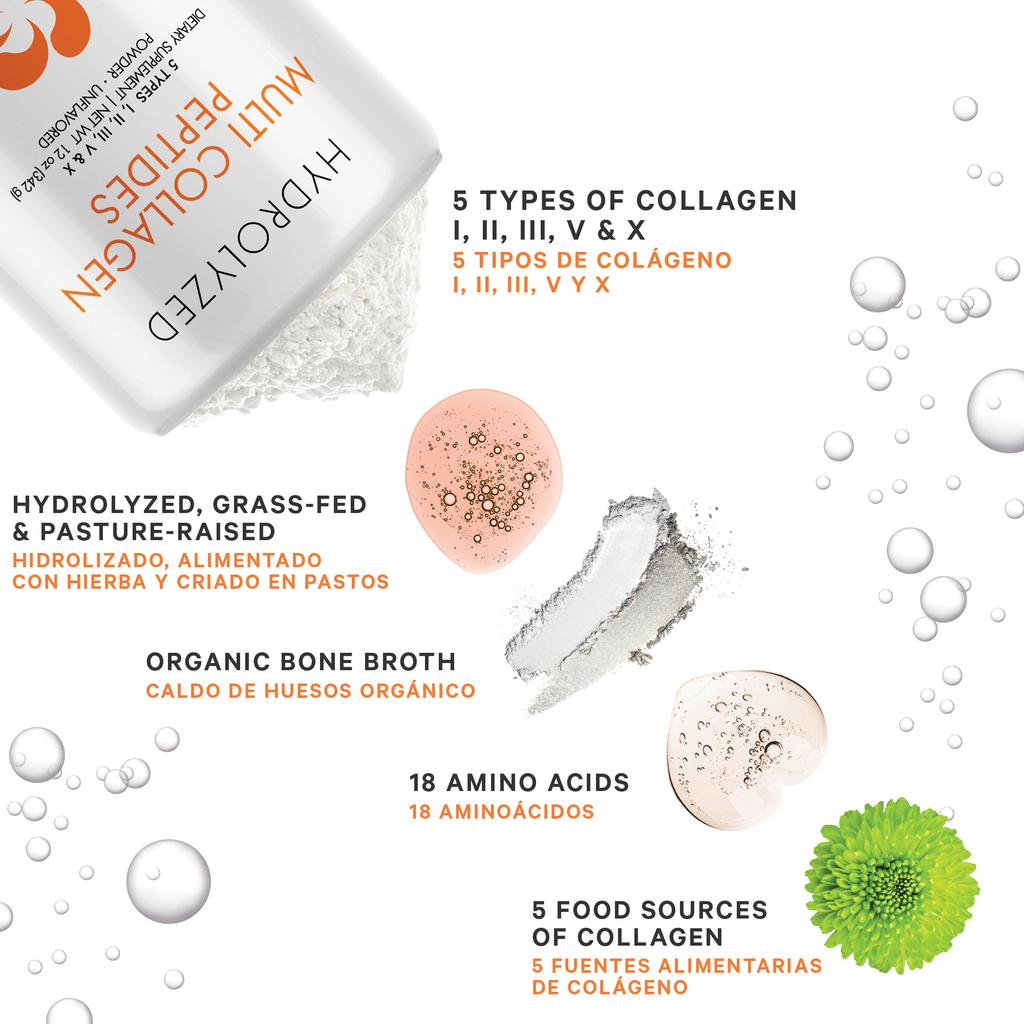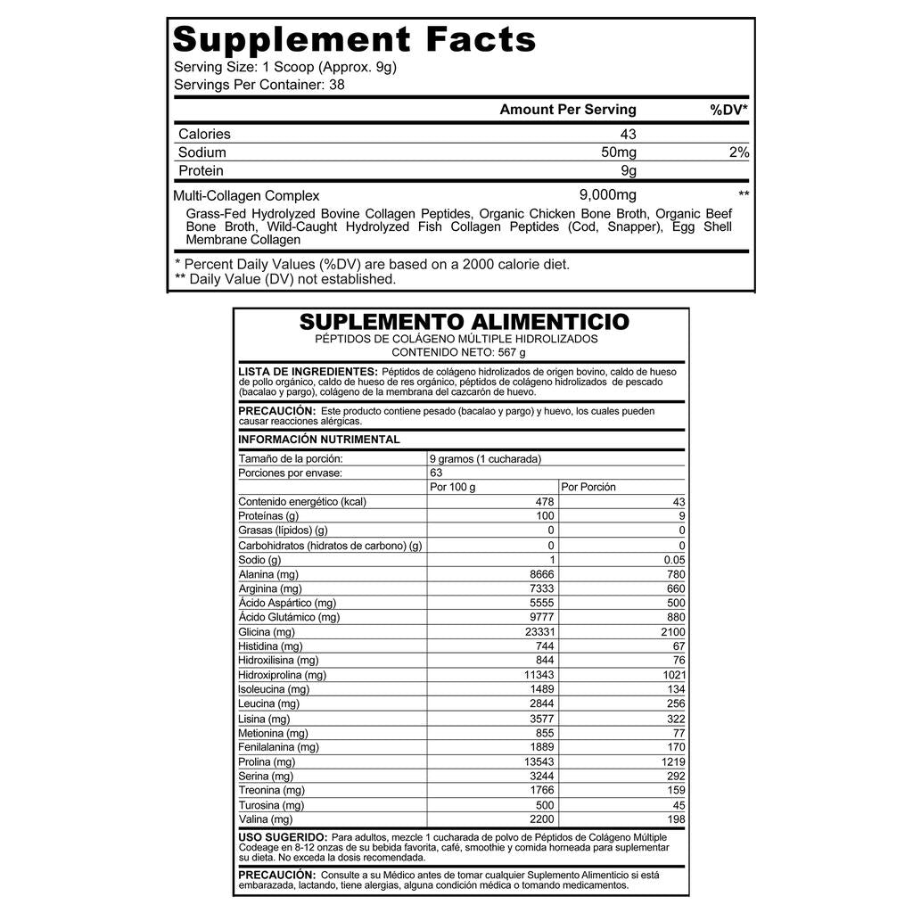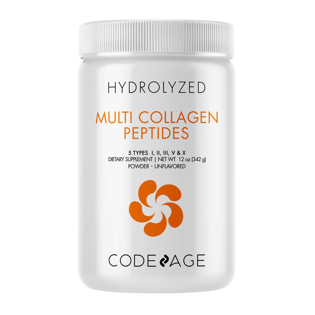 Codeage Multi Collagen es un suplemento premium que combina 5 tipos de colágeno hidrolizado (I, II, III, V y X) provenientes de 5 fuentes alimentarias limpias: res alimentada con pasto, pollo de corral, pescado salvaje, caldo de hueso y membrana de cáscara de huevo. Rico en 18 aminoácidos esenciales, sin azúcar ni carbohidratos.